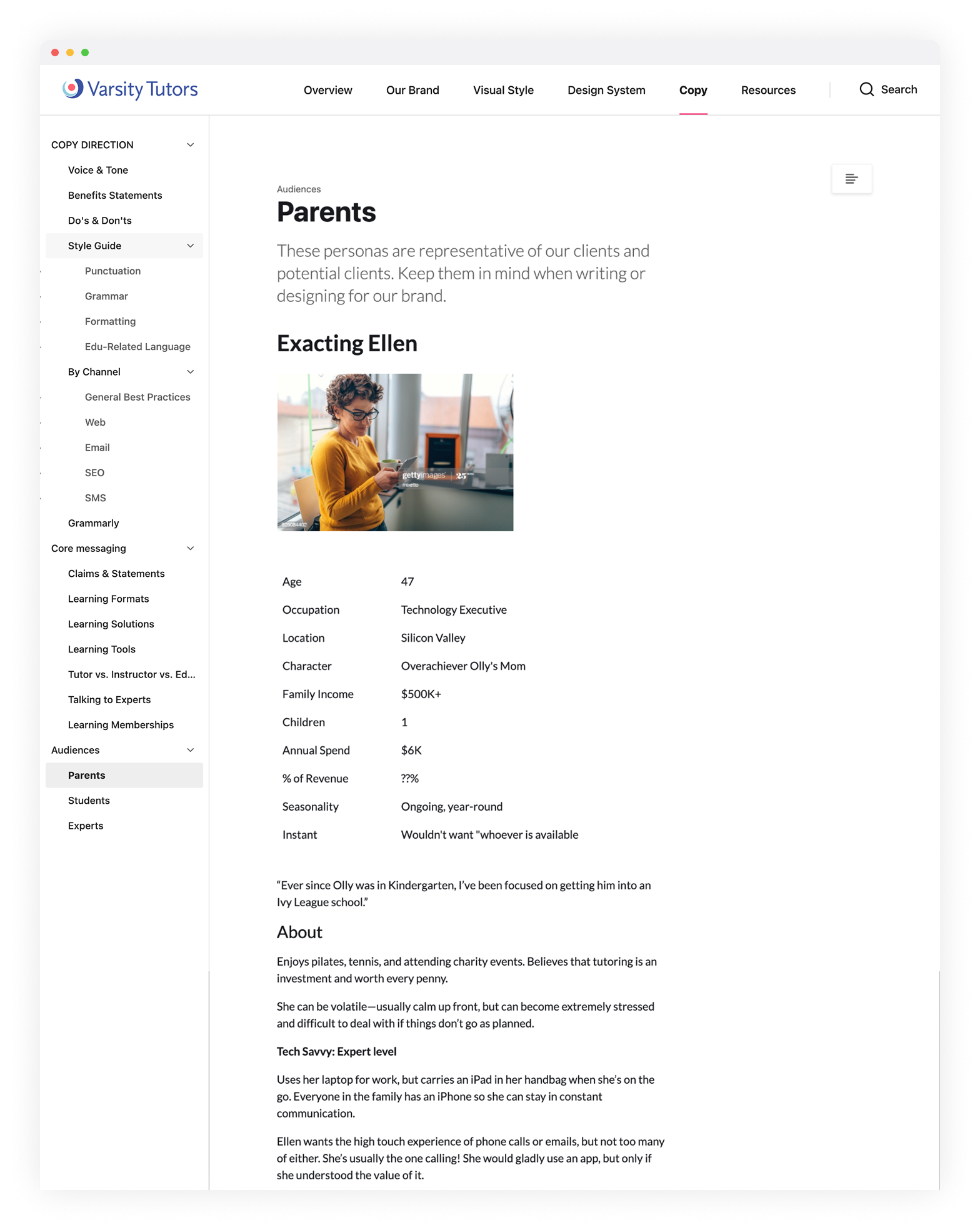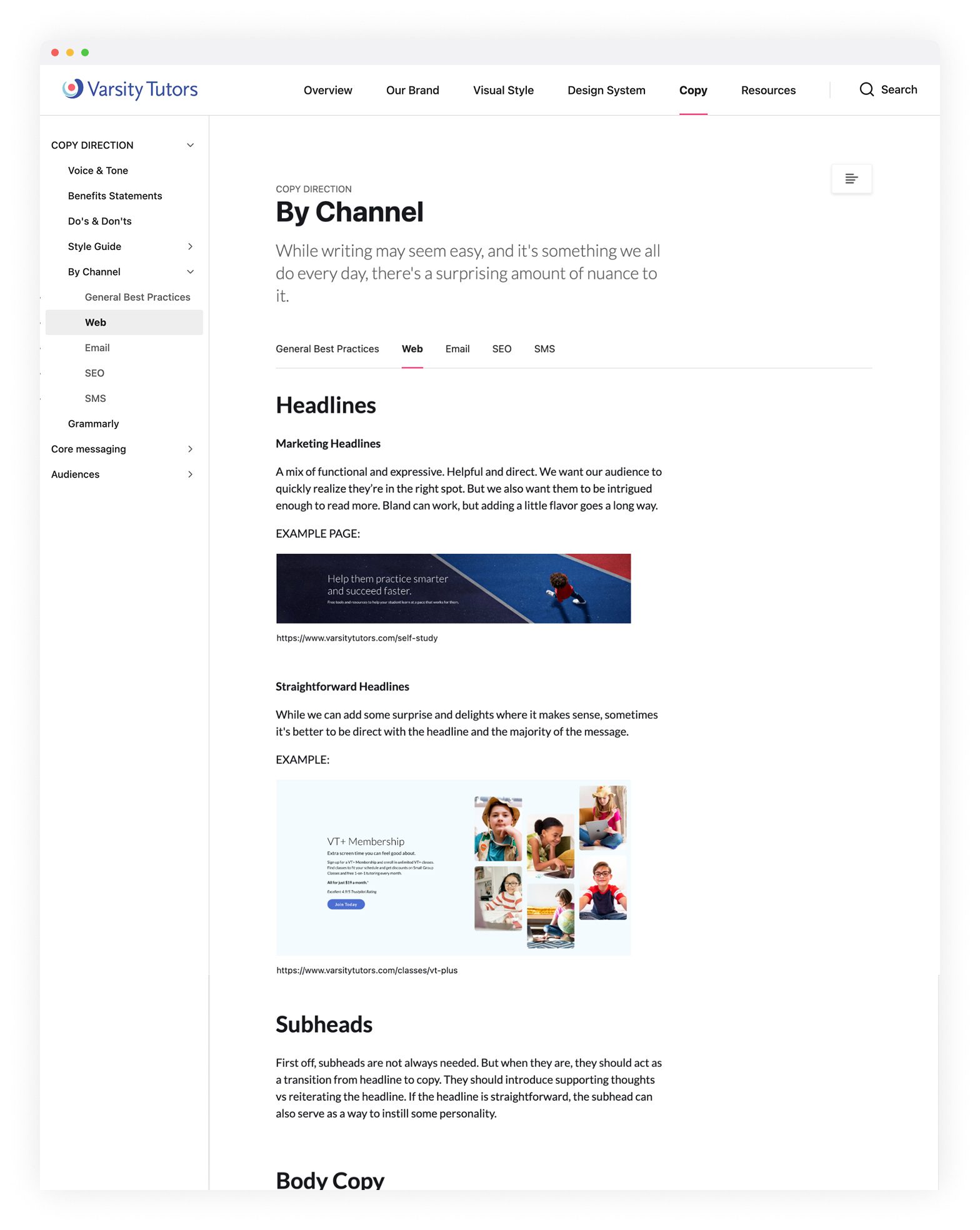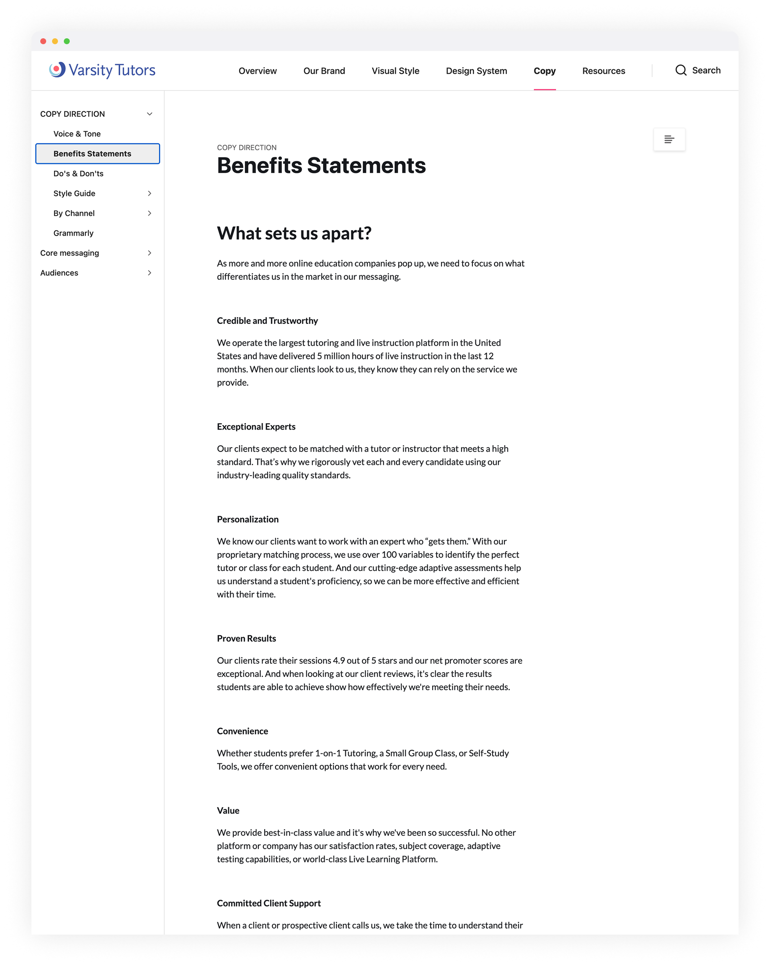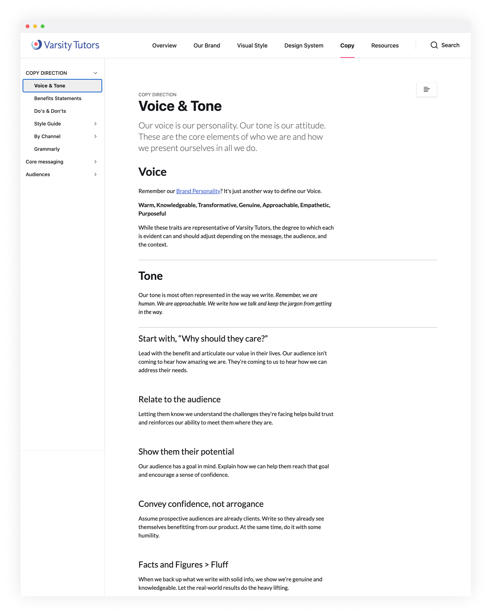 We built out comprehensive guidelines (full site) and conducted training so internal teams and agency partners could craft copy that aligned with the brand.